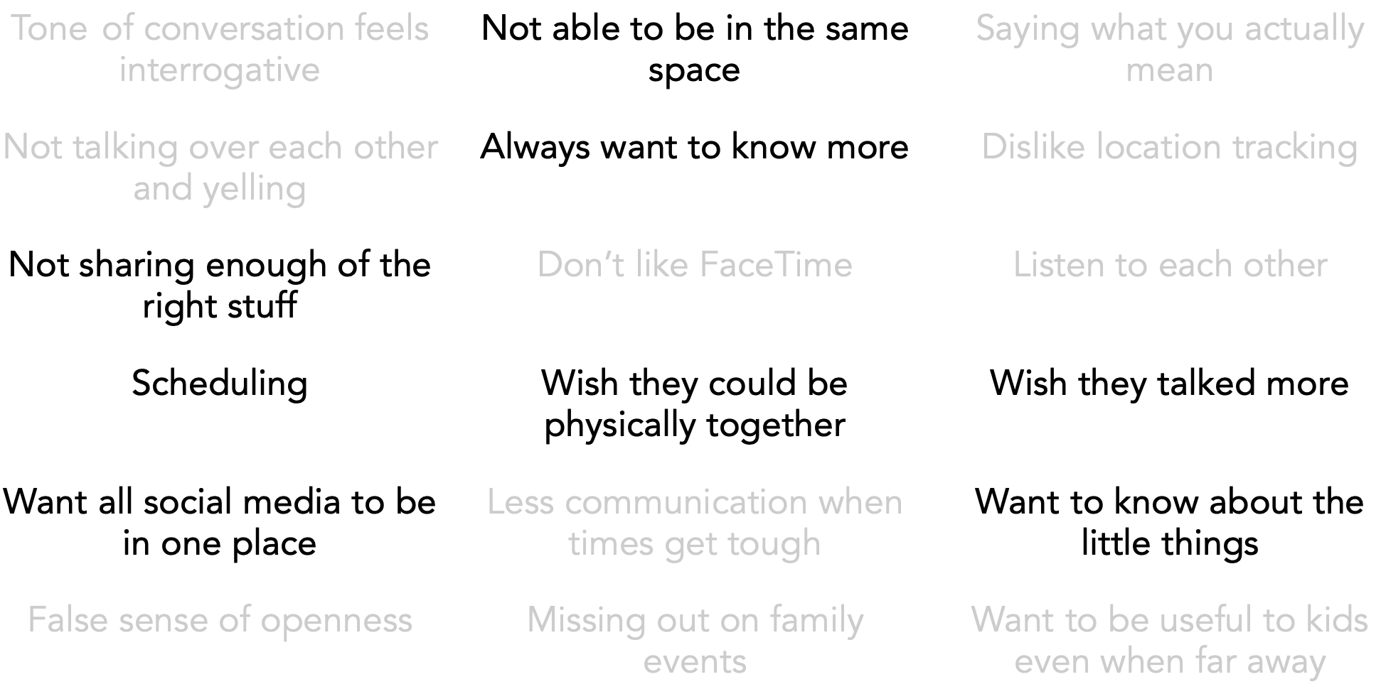 To begin tackling this question, we interviewed 5 families, talking to college students, parents, and siblings separately. We also sent out a diary log to students and parents, asking them to document all of the times that they thought about their family (when, why, did they reach out) over the course of 3 days.